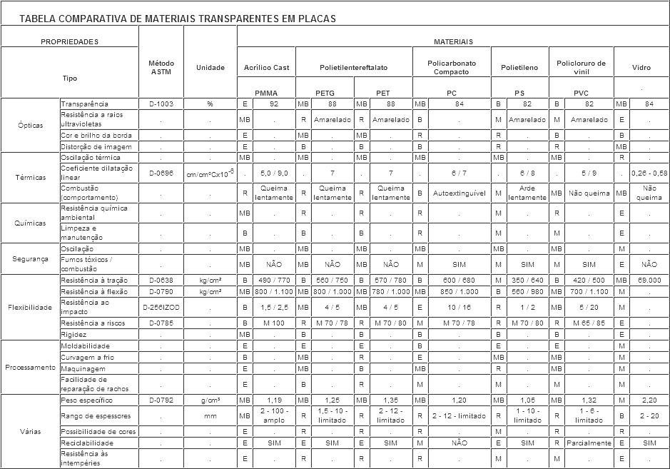 - Policarbonato (PC): Excelente resistência a impacto, fácil de curvar a frio, discreta resistência às intempéries, pouca cor e brilho de borda, difícil de termoformar, risca-se facilmente, não há possibilidades de reparos, difícil de limpar e manter, não é reciclável.