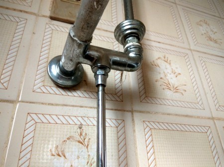 A altura da caixa d'água fria esta a 1m do registro e da água quente entre 1m e 2m do registro. A instalação da água fria e quente e da seguinte maneira: O cano da água fria e embutido na parede e da água quente externa e são ligado por um T, conforme imagem: