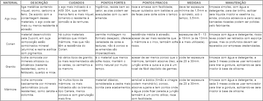 Segue abaixo quadro comparativo entre os principais materiais utilizados para pia: